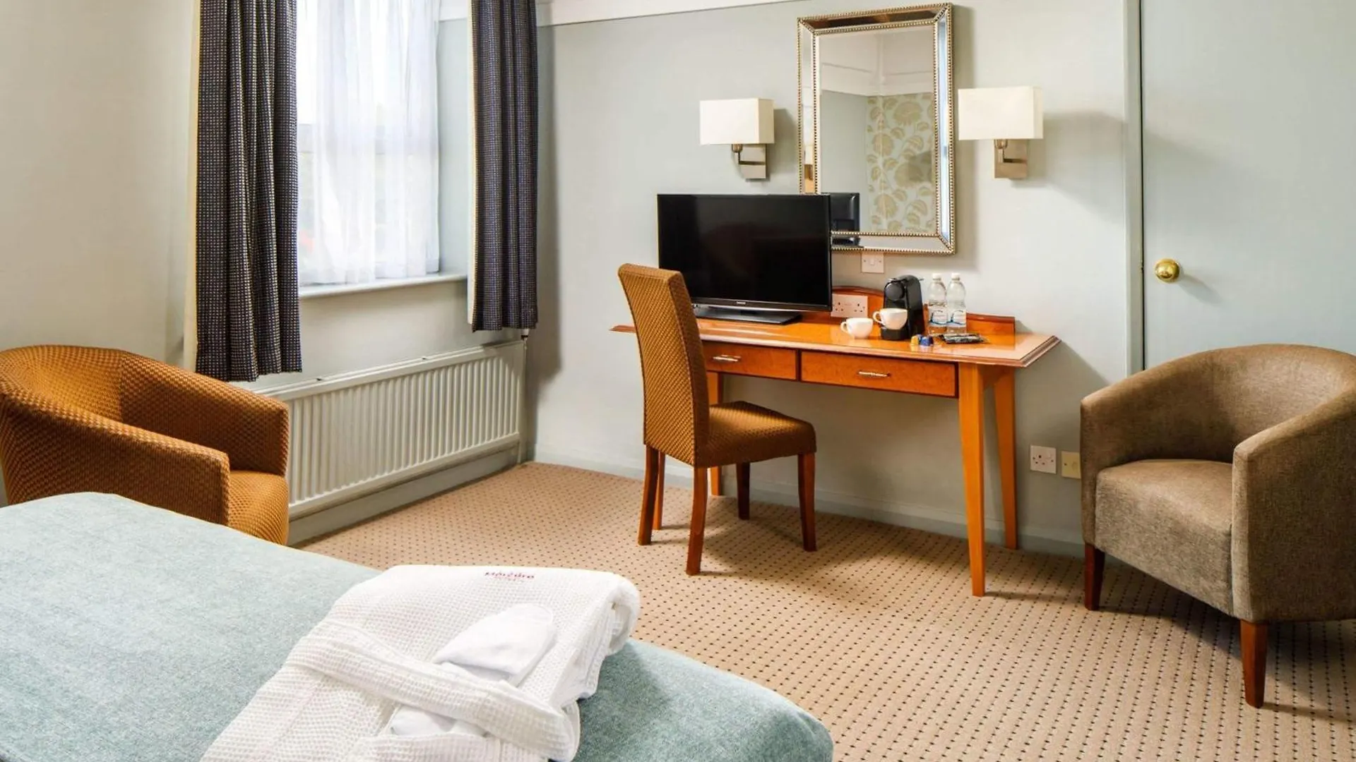 The rooms have attached bathrooms with a separate toilet, a bath, and a shower. It features modern units offering views of the garden. Mercure Bolton Georgian House Hotel offers 87 modern rooms with modern bathrooms.