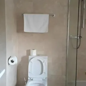 The rooms have private bathrooms with a walk-in shower and a separate toilet. Also, the property features carpet flooring.